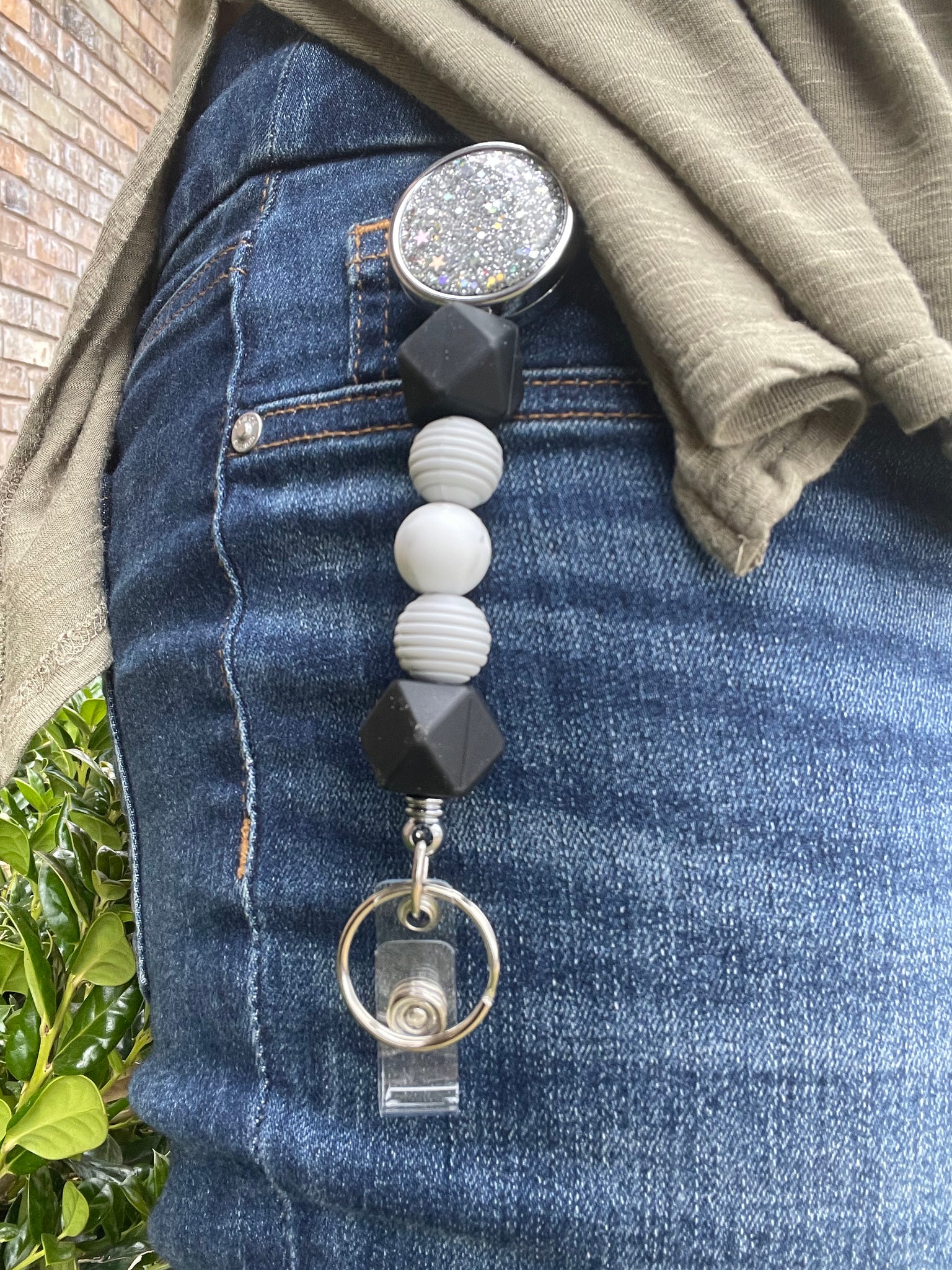 A sparkly silver top with black, grey, and marble beads in hexagon, beehive, and round shapes on the cord make this badge reel fictional, fun, and fidgetable!