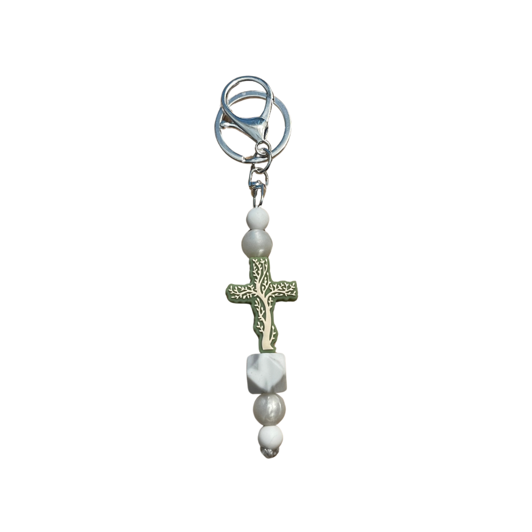 A perfect yet simplistic Easter holiday gift, this beautiful, tree-embossed cross silicone bead is surrounded by white and pearlescent silicone beads and is perfect for tactile fidgeting! Strung on elastic-nylon cording and secured to a keychain clasp.