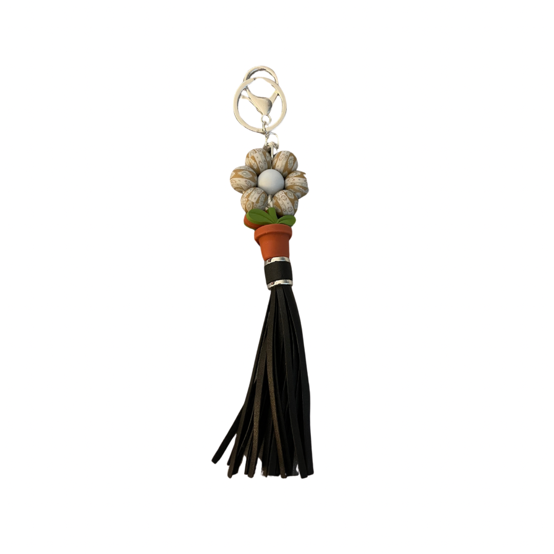 A fun silicone-beaded flower design keychain with a faux-leather fringe tassel incorporated into the bottom for lots of fun, gentle fidgeting!
