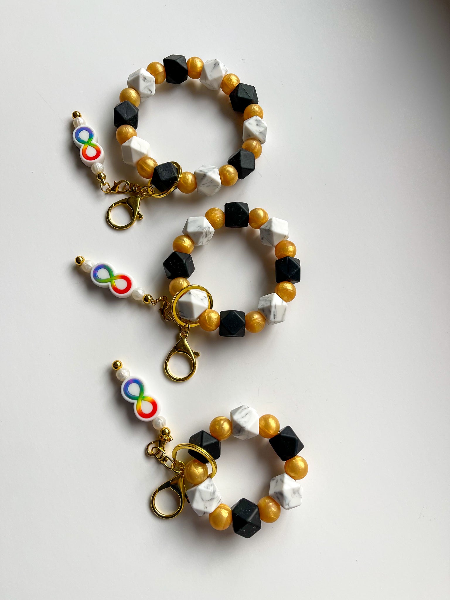A fun, durable silicone-beaded wristlet featuring white-marble and black hexagon beads with pearlescent gold beads and adorned with a gold-&-rainbow silicone infinity bead fidget-charm, this wristlet is a fun and functional way to show your support for the autism community.