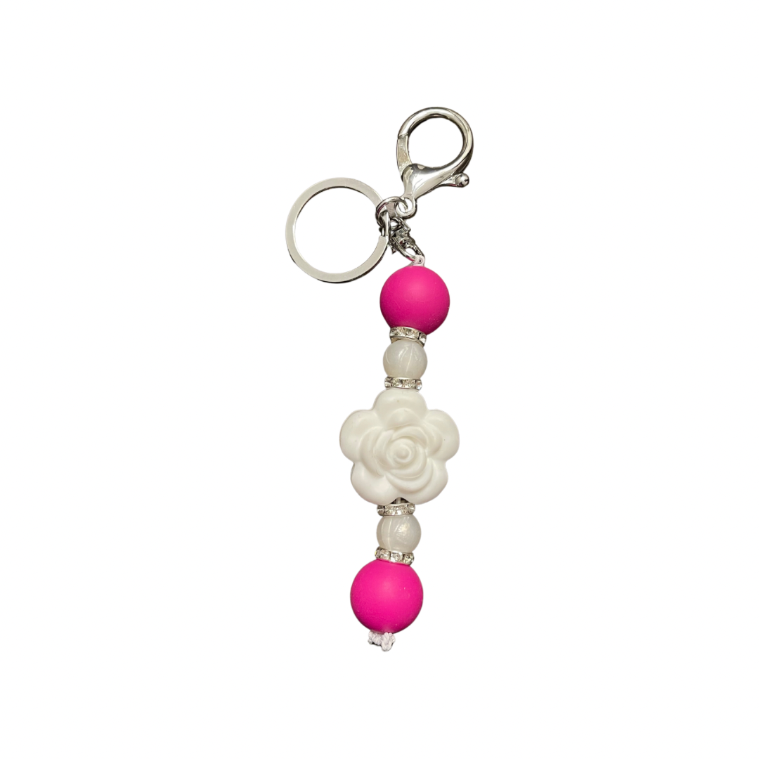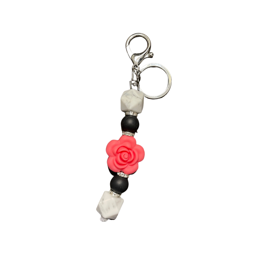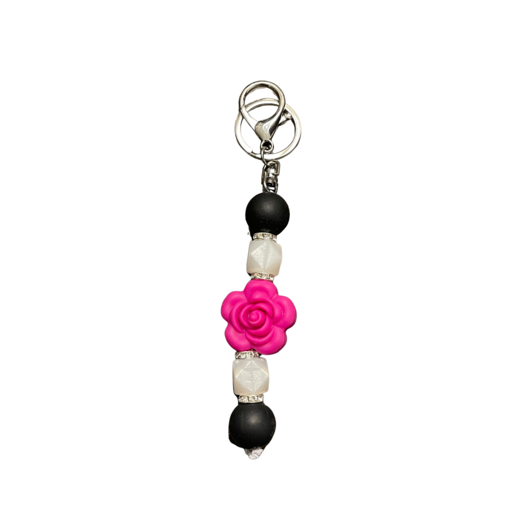 A pretty and textured rose focal silicone bead in between an array of round and/or hexagon silicone beads and a dash of bling! All strung on silver keychain clasps and elastic-nylon cording.
